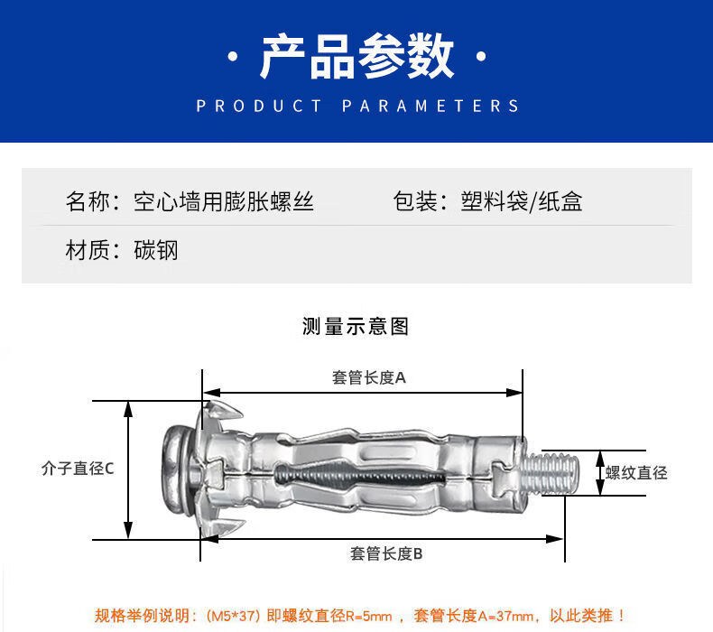 商品名称:腾驰(CT)空心砖专用膨胀螺栓飞机石膏板膨胀螺丝中空壁虎管膨胀钉 M8*37(1个)